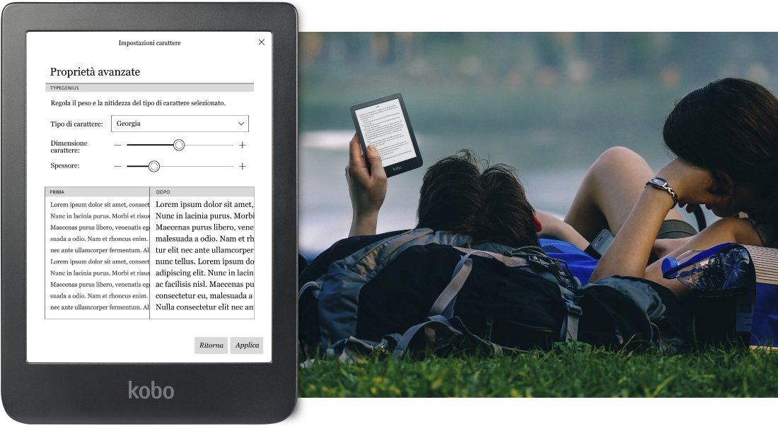 Scegli tra oltre 50 dimensioni e 12 tipi di carattere. Con i margini regolabili, la possibilità di evidenziare passaggi, prendere appunti e cercare una parola nel dizionario integrato sempre a portata di mano, le possibilità sono infinite.
